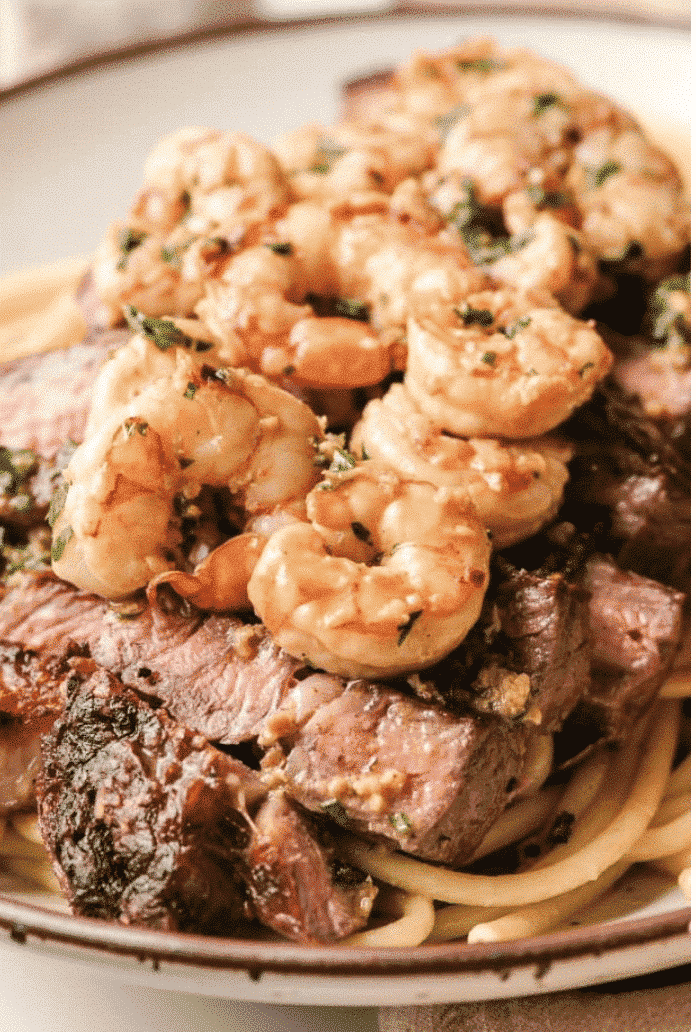 4 oz Angus Beef Grilled Tri-TIp, Garlic-Shrimp-Lemon Scampi, Spaghetti, Spinach, Asparagus