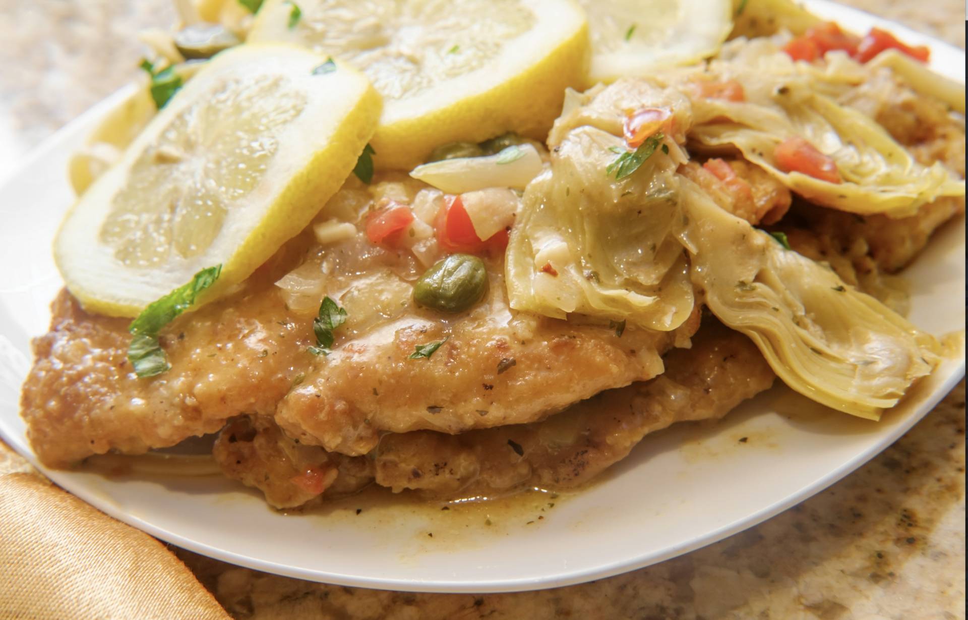 Grilled Chicken, Lemon-Herb-Artichoke Piccata Sauce with Artichoke Hearts, Creamy Spinach Polenta, Broccoil and French Green Beans