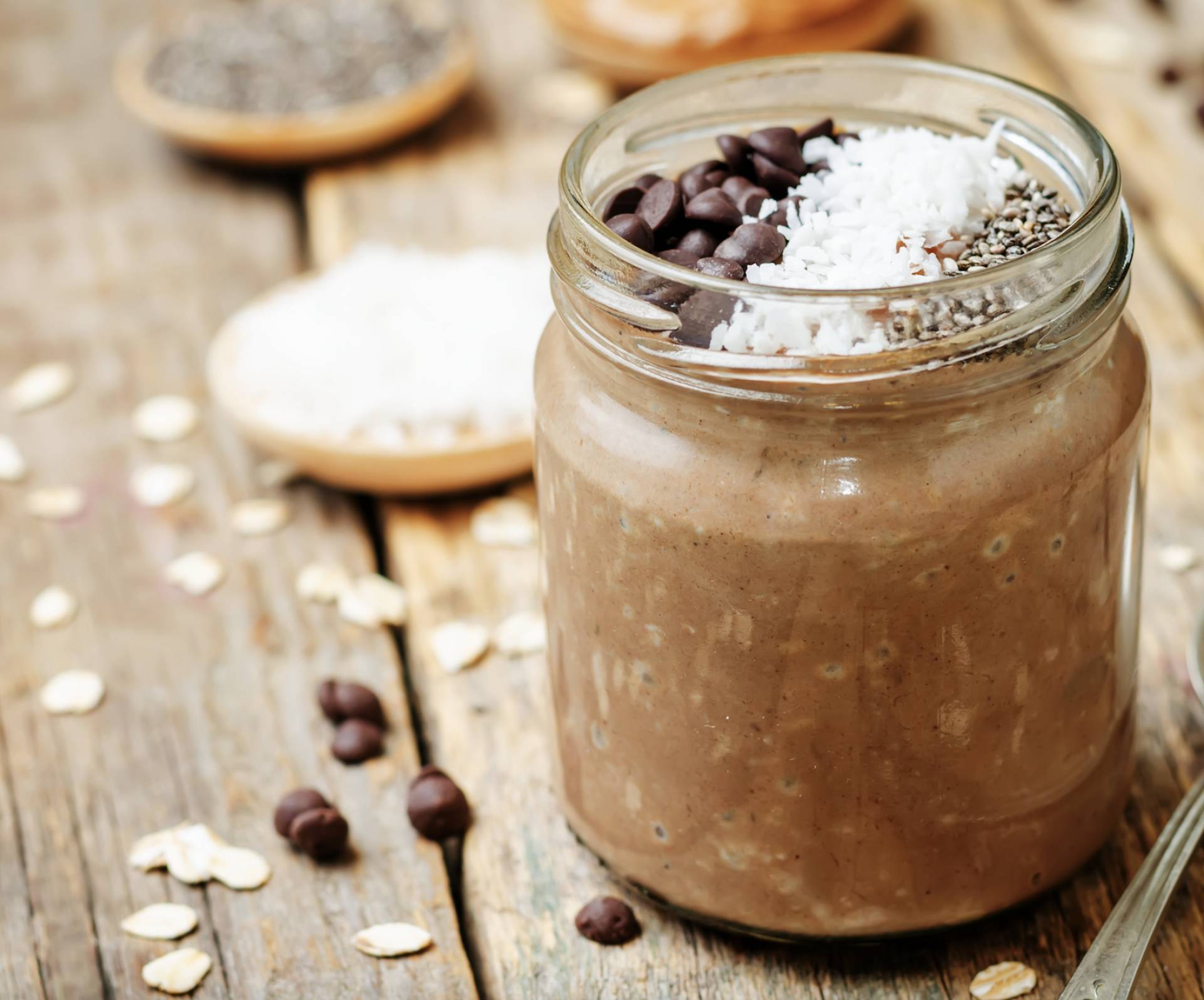 Steel Cut Oats, Keto Chocolate Chips, Organic Coco Powder, Protein Powder, Toasted Almonds Non Fat Greek Yogurt, Almond Milk